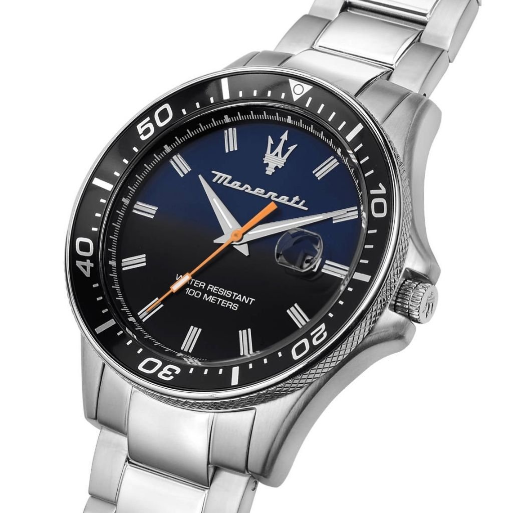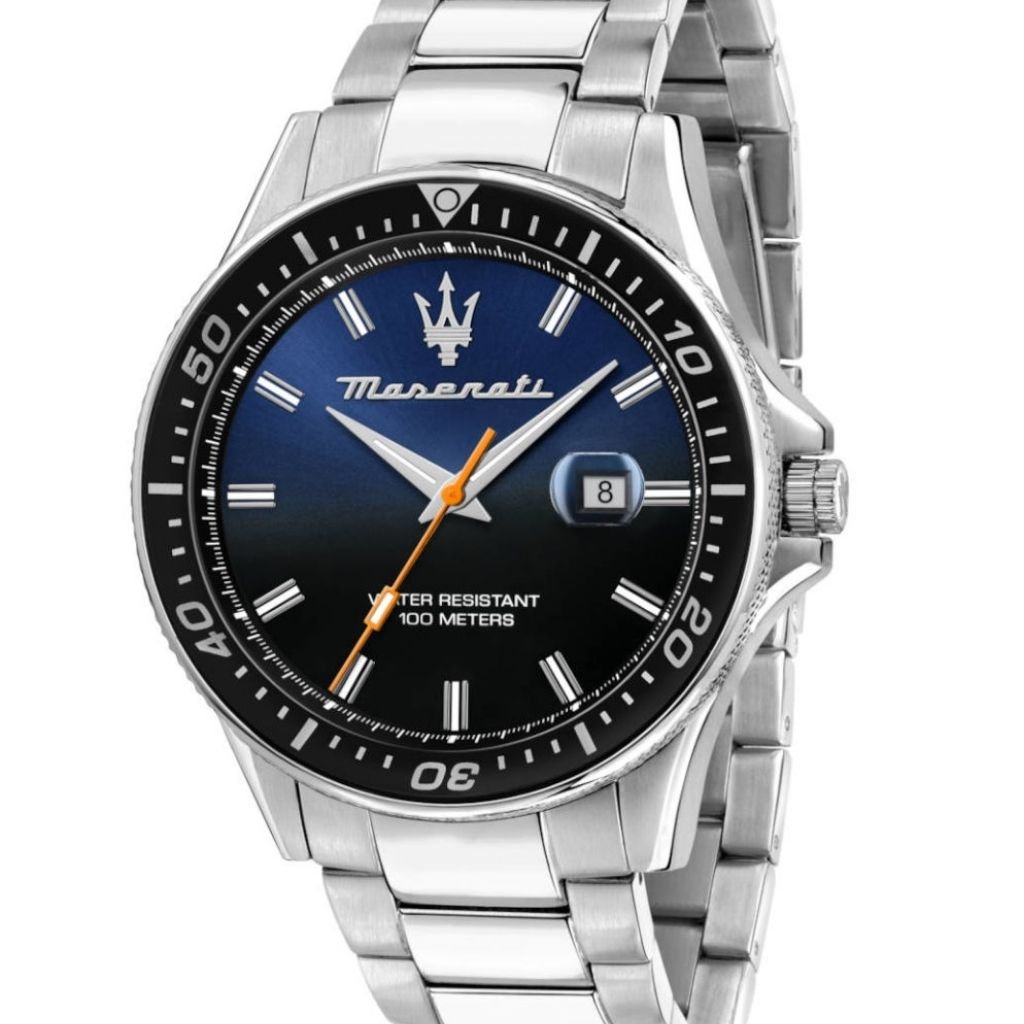 - Ανδρικό ρολόι διαμέτρου 44mm με μηχανισμό Quartz ακριβείας.Έχει δίχρωμο καντράν, μπλε και μαύρο με ασημένιους δείκτες και ένδειξη ημερομηνίας. Η κάσα του είναι από ανοξείδωτο ατσάλι με κρύσταλλο από ορυκτό κρύσταλλο ειδικής σκλήρυνσης. Έχει μπρασελέ από ανοξείδωτο ατσάλι με κούμπωμα ασφαλείας. Είναι αδιάβροχο (10 ATM).Συνοδεύεται από κουτί συσκευασίας MASERATI και